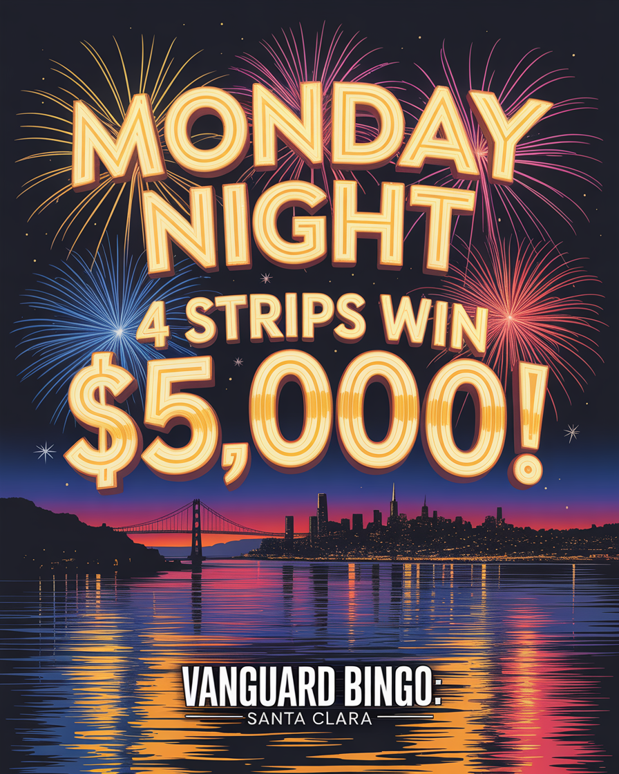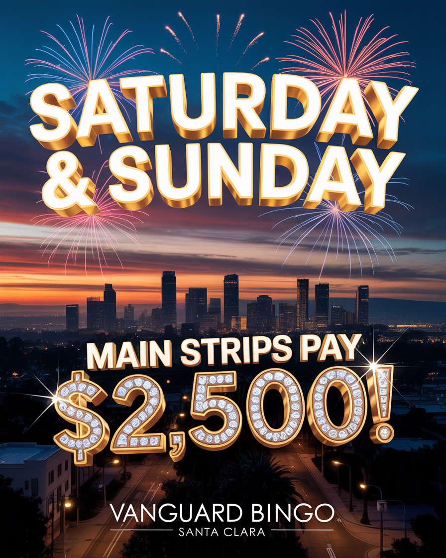 Avoid the line and get special bonuses when you purchase your buy-in online. Online sales end at 2:45 PM for night games, and 10:45 AM for Matinees, and all refunds end at that time. NO EXCEPTIONS. For more information, please contact Vanguard Bingo or call 408-727-2185. ALL ATTENDEES MUST BE AT LEAST 18 YEARS OF AGE TO PLAY BINGO. Vanguard Bingo offers a friendly environment with an exciting, faced pace Bingo game. You will be on the edge of your seat as you play for huge cash prizes.
