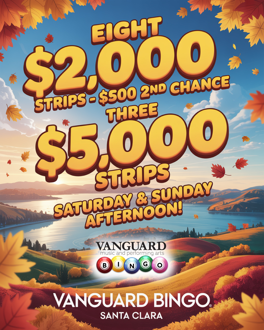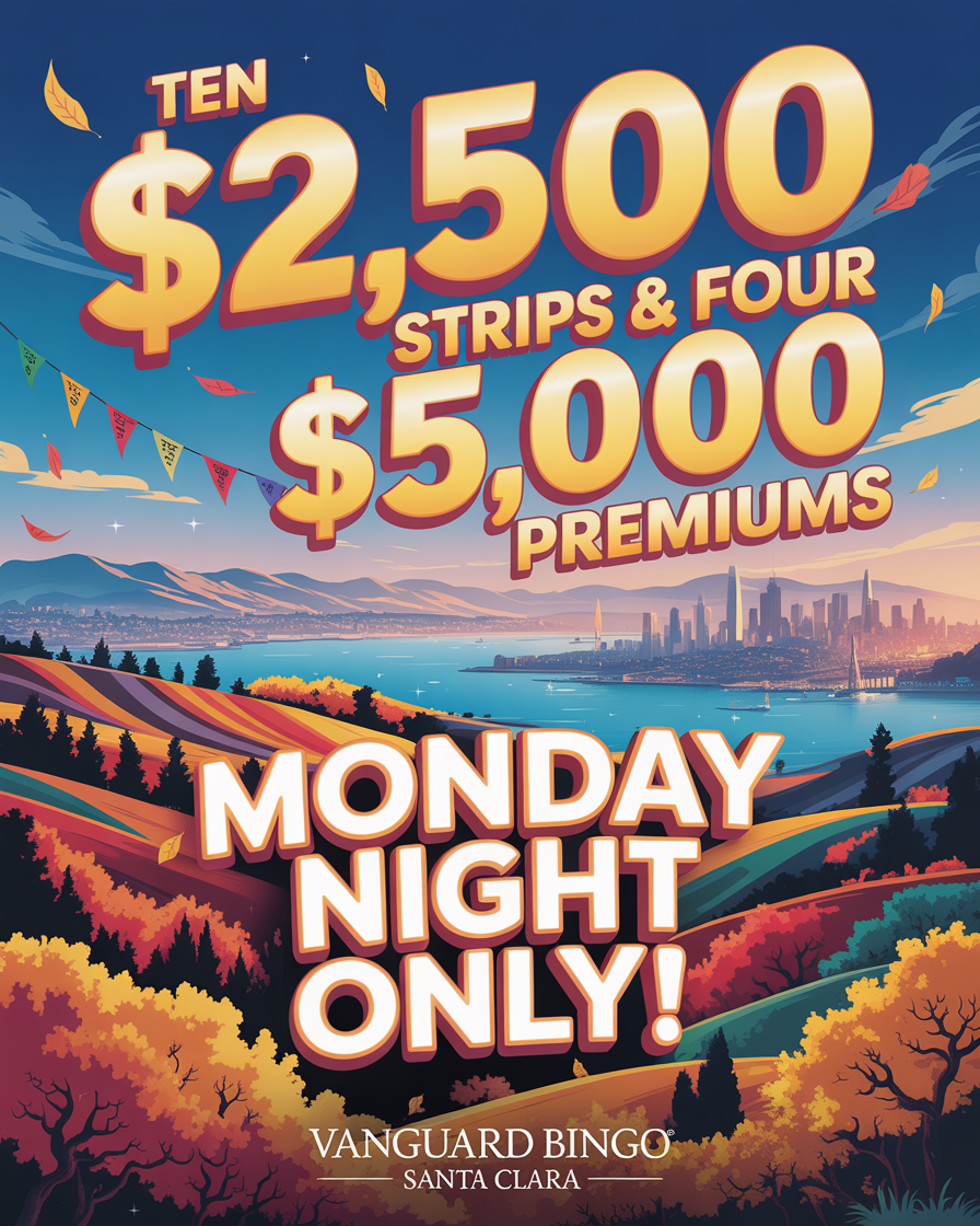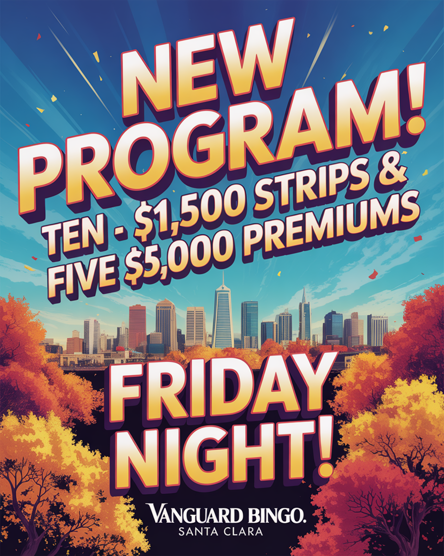 Start your weekend off BIG! This Friday night at Vanguard Bingo – Santa Clara, we’re upping the stakes with FIVE Premium Strips paying $5,000 EACH PLUS TEN Strips pay $1,500 EACH!
